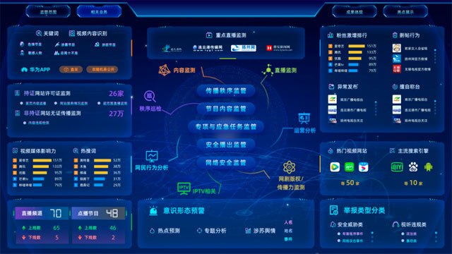 打破“一个业务、一个系统、一套设备”的建设模式。实现网络视听新媒体各类业务在一个平台上融合监管、监管大数据在一个平台上汇聚共享、监管结果在一个平台上收录发布,实现了全业务、全流程、多维度的智能化、便捷化监管。