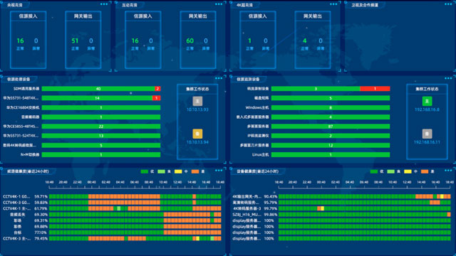 对台站内信号、设备、动环、安防状况进行全方位采集监测、可视化呈现,便于台站值班人员实时掌握全台站运行运行,出现异常情况时能够实现精准运维排障。